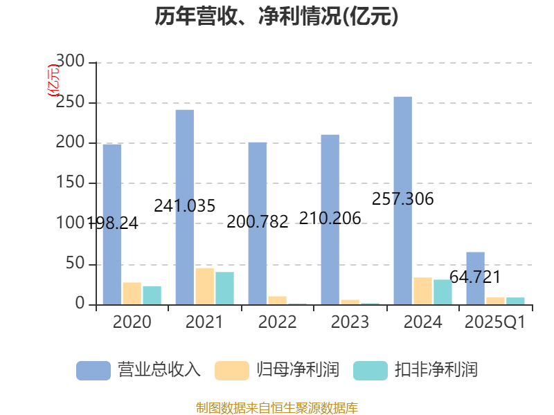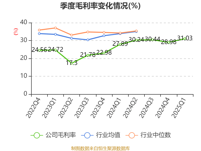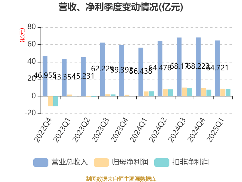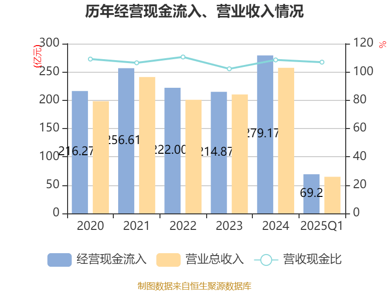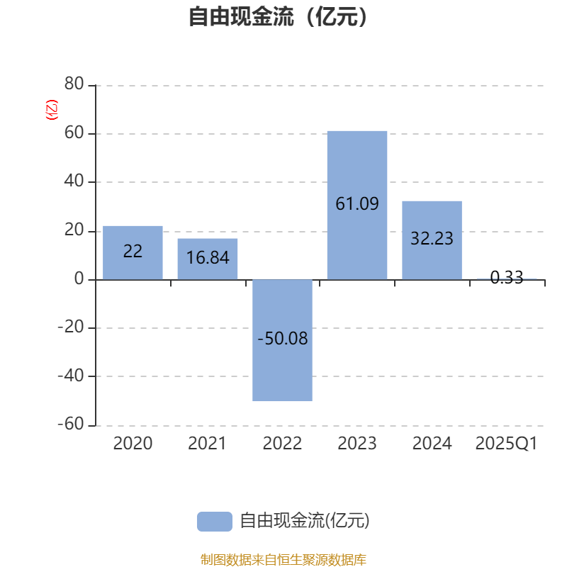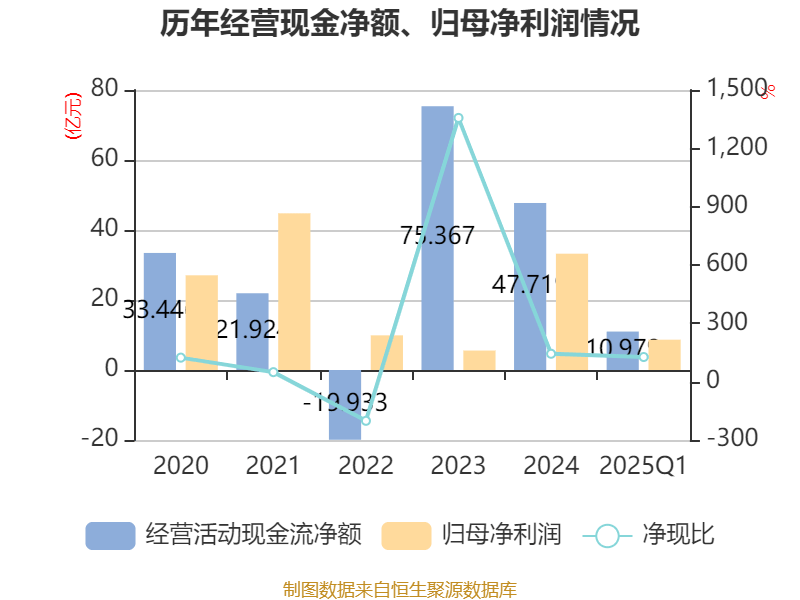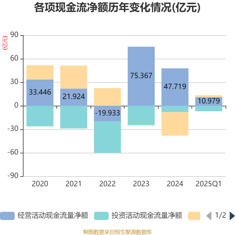 截至2025年一季度末,公司经营活动现金流净额为10.98亿元,同比下降1.12%;筹资活动现金流净额2.42亿元,同比增加24.5亿元;投资活动现金流净额-7亿元,上年同期为-1.66亿元。