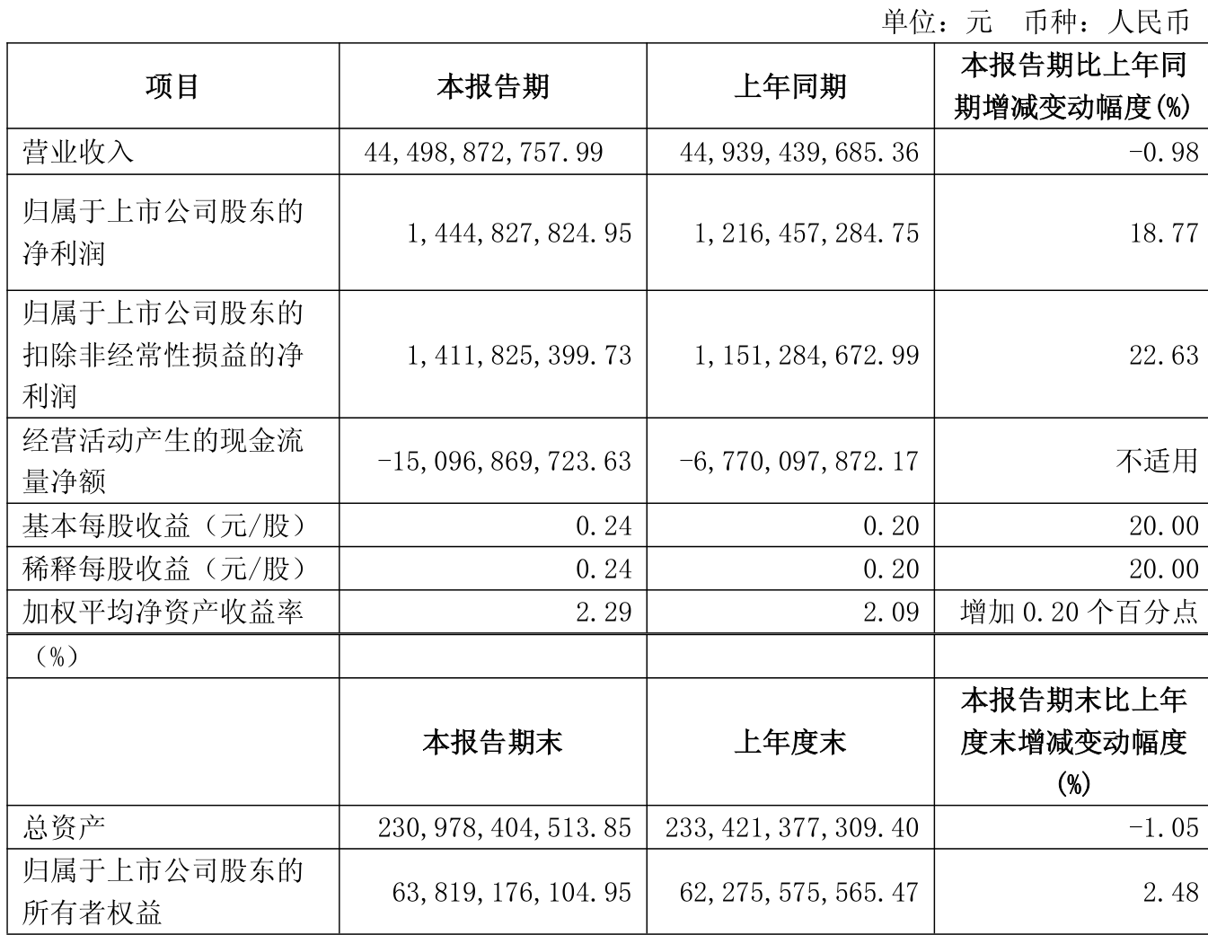 中证智能财讯 中国化学(601117)4月30日披露2025年第一季度报告公司实现营业总收入446.53亿元,同比下降1.15%;归母净利润14.45亿元,同比增长18.77%;扣非净利润14.12亿元,同比增长22.63%;经营活动产生的现金流量净额为-150.97亿元,上年同期为-67.7亿元;报告期内,中国化学基本每股收益为0.24元,加权平均净资产收益率为2.29%。
