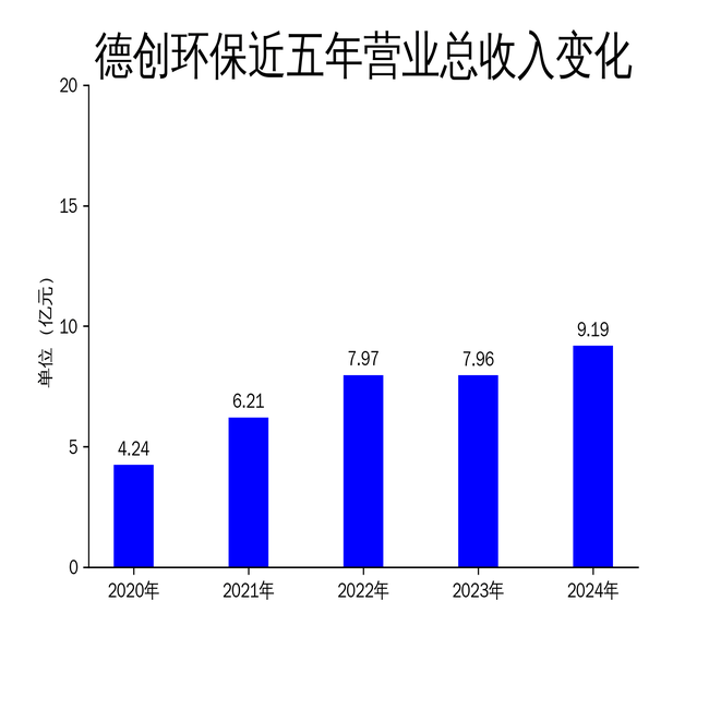 2025年5月1日,德创环保发布2024年年报,公司实现营业总收入9.19亿元,同比增长15.43%;归属于上市公司股东的净利润2286.55万元,较2023年的-0.48亿元实现扭亏为盈,同比增长147.22%。