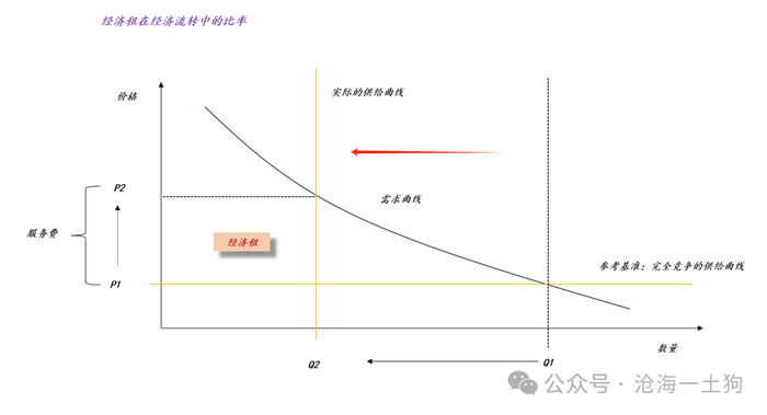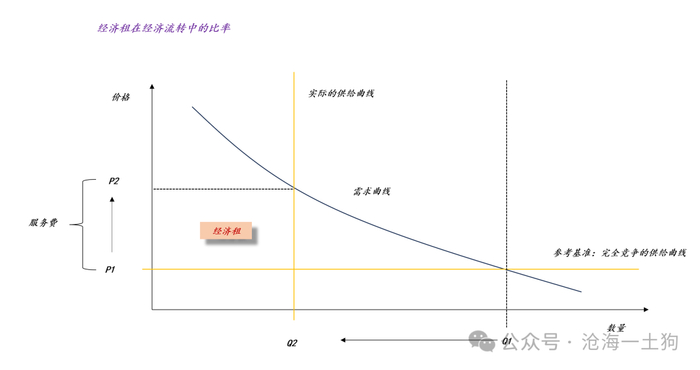 如上图所示,假设整个经济体中只有一种标准的商品,基准情形是完全竞争的情形,对应于价格P1;在实际情形中,实际的供给曲线或多或少的偏离基准情形,偏离得越大,实际价格P2越高不难发现,P2和P1的差价是各种租的加总,我们可以把他归结为。
