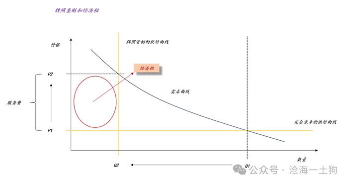 后面在这个市场里经营的人,只能获得P1的社会平均利润(ps:完全竞争市场的价格),P2减掉P1的超额利润,早就被最开始寻租的人员以资本化的方式拿走了最后,也就造成了一个特别诡异的局面,一方面消费者承受了很高的打车价格P2;另一方面,出租车司机却只能赚P1的社会平均利润。