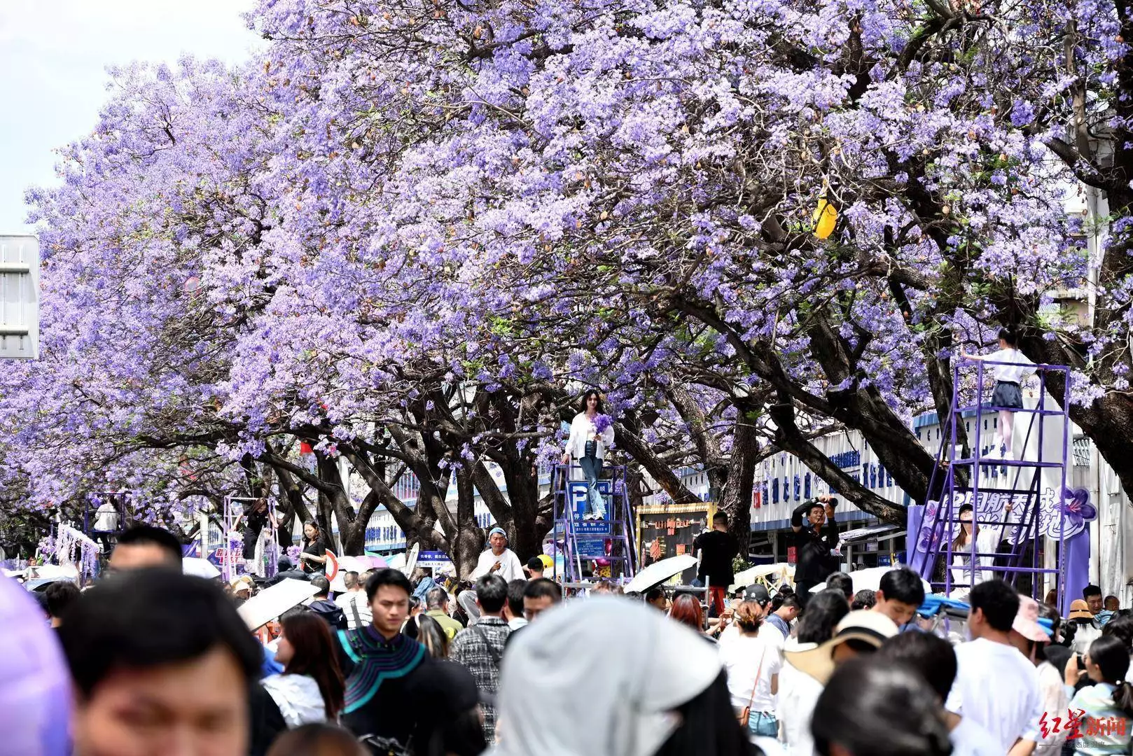 ▲游客在蓝花楹树下拍照打卡“最近几天,每天都有成千上万人来这里打卡拍照。”航天北路商家王先生告诉红星新闻,蓝花楹每年都会开,以前这条路没有那么火爆;随着网络越来越发达,最近几年特别火。