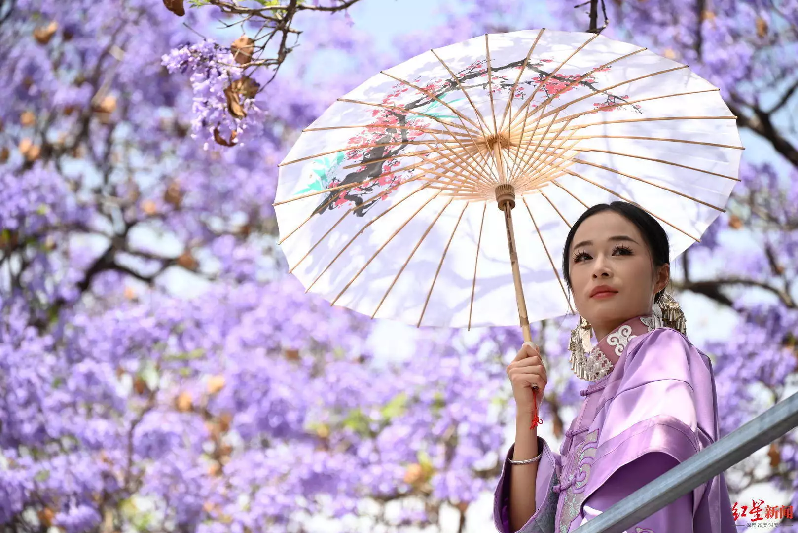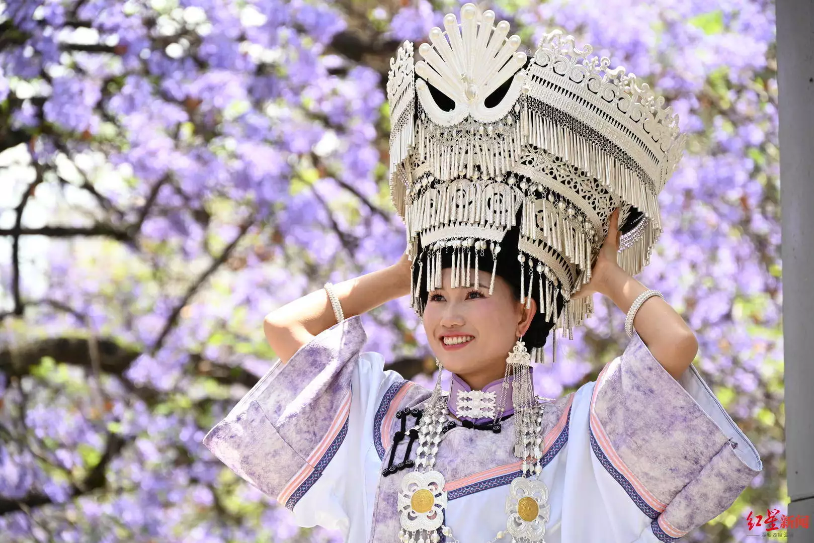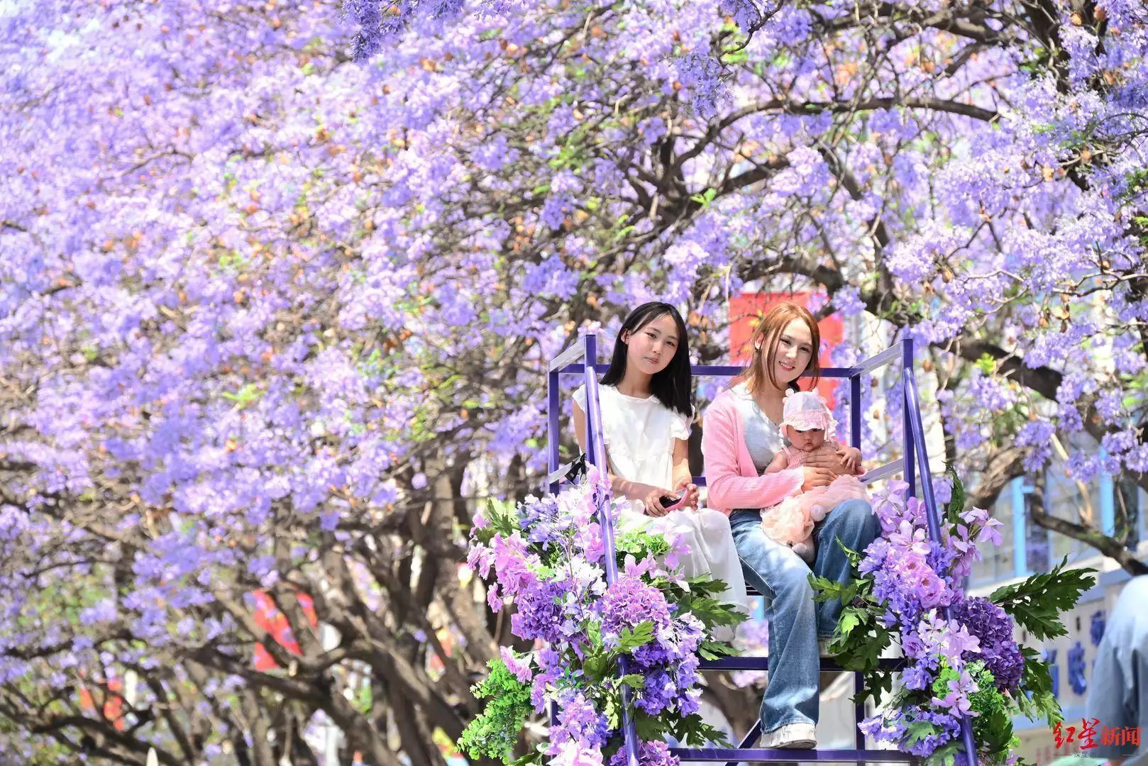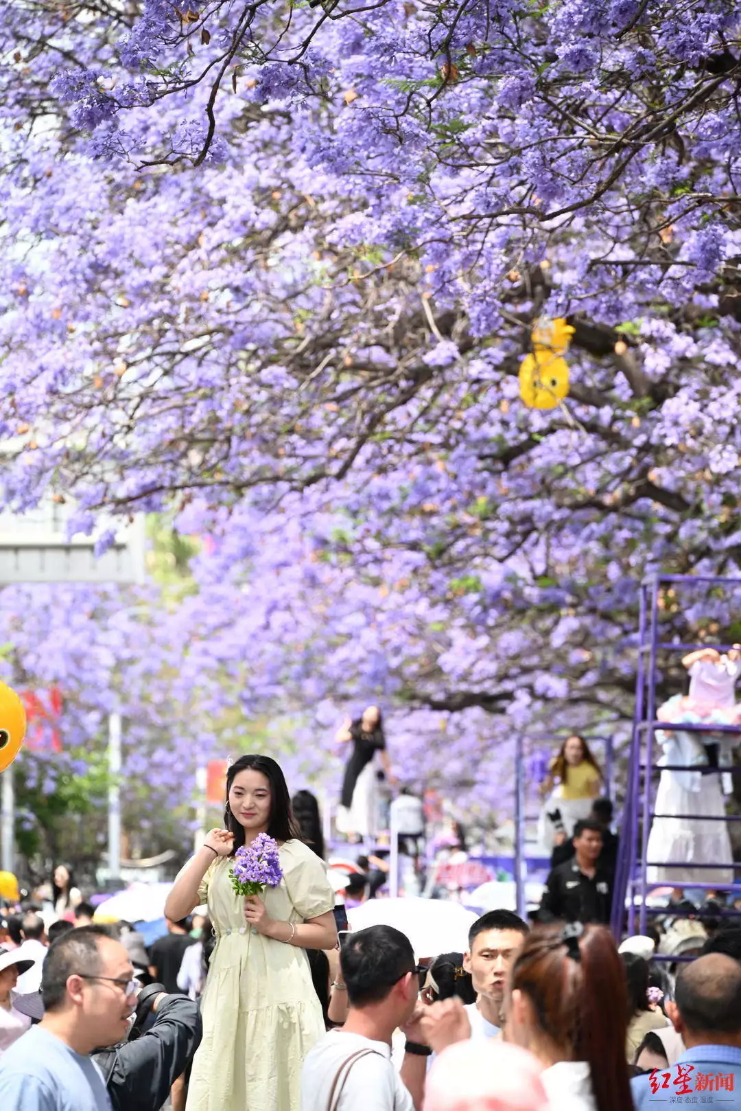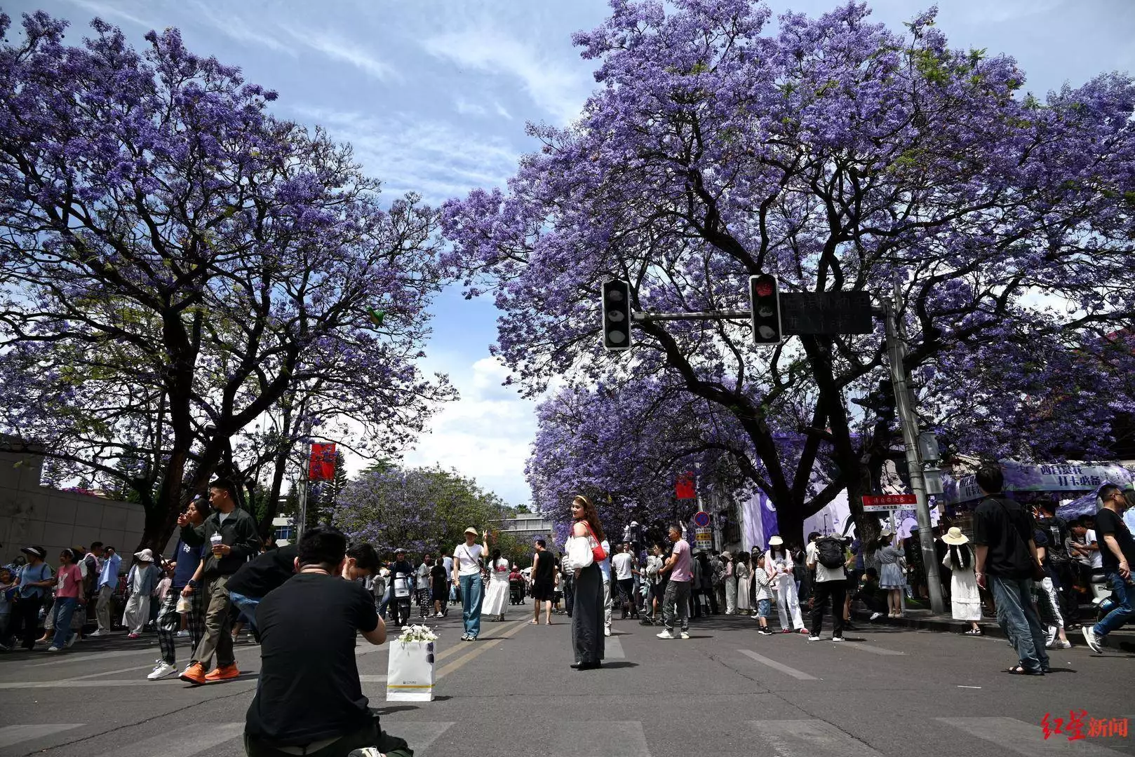 ▲游客在蓝花楹树下拍照打卡5月1日中午,红星新闻记者在航天北路看到,蓝天白云下,航天北路的数十棵蓝花楹格外显眼,层层叠叠的蓝紫色花穗倾泻而下,将街道染成“紫色海洋”身着绚丽彝族服饰的姑娘,漫步于蓝花楹下,每一个画面都流淌着自然与人文交织的诗意之美。